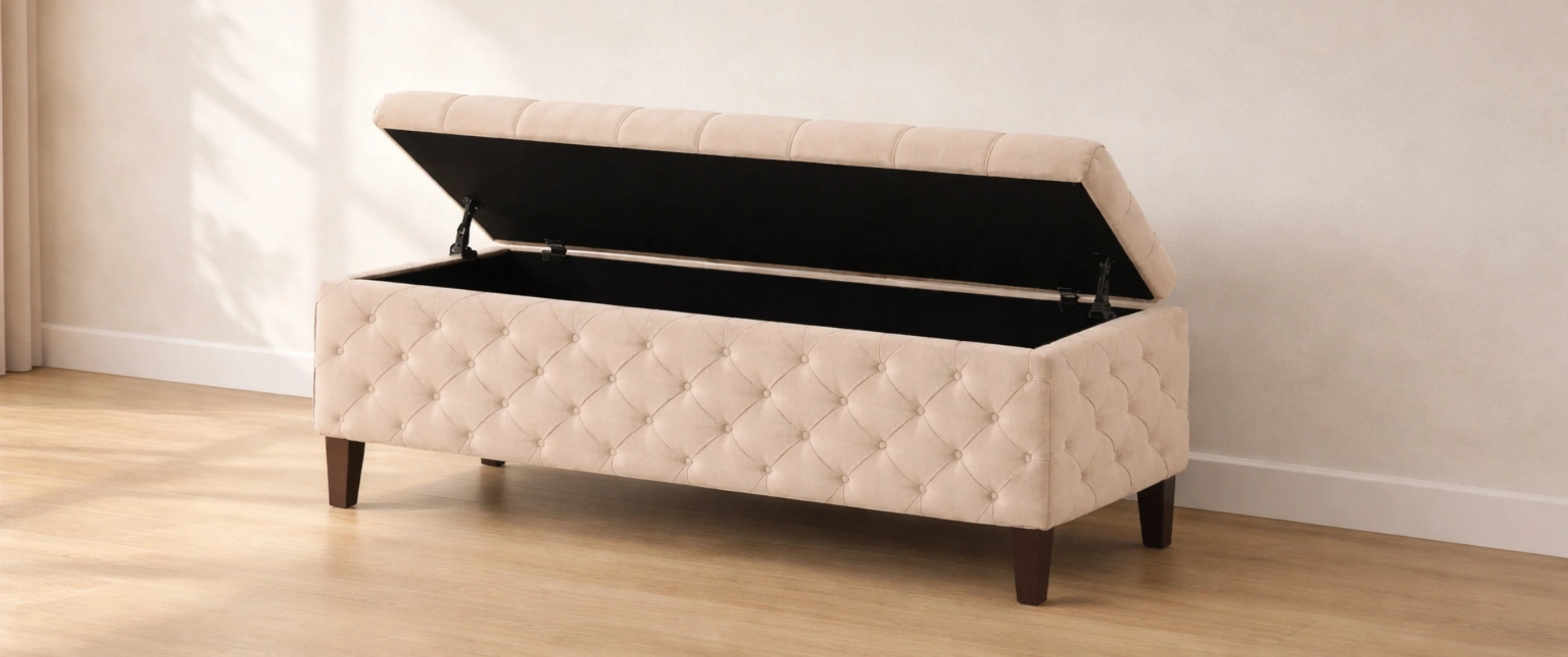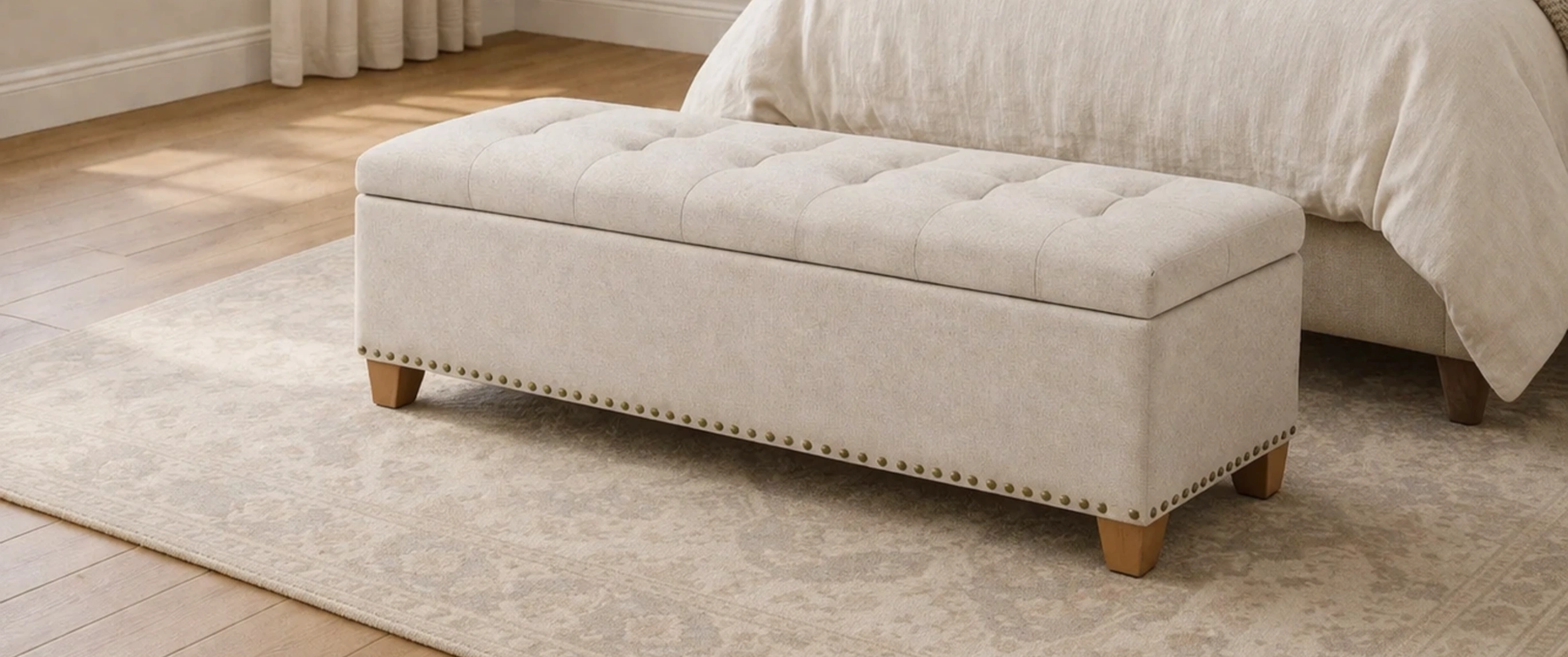 Banc de rangement en tissu beige avec pieds en bois
