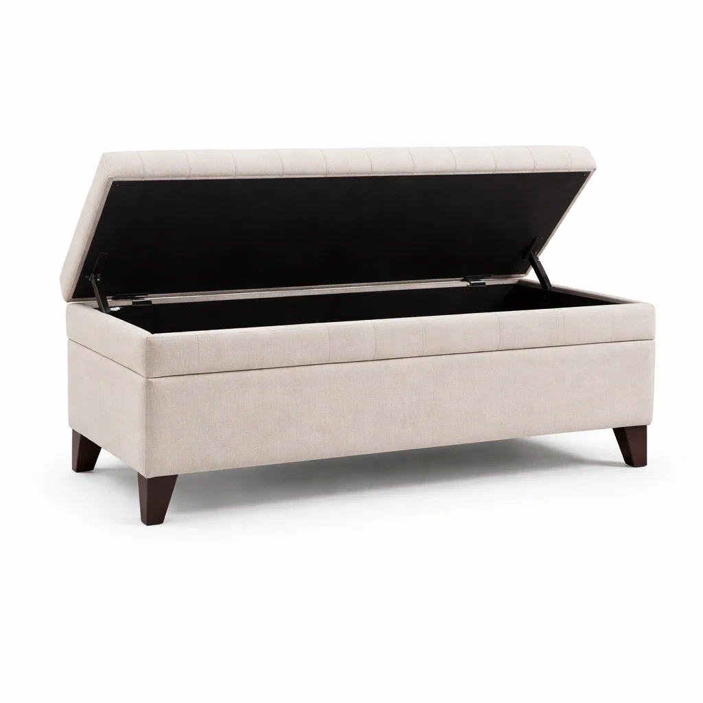 Le banc dispose d'un rangement intégré et d'un système d'ouverture avec charnières.